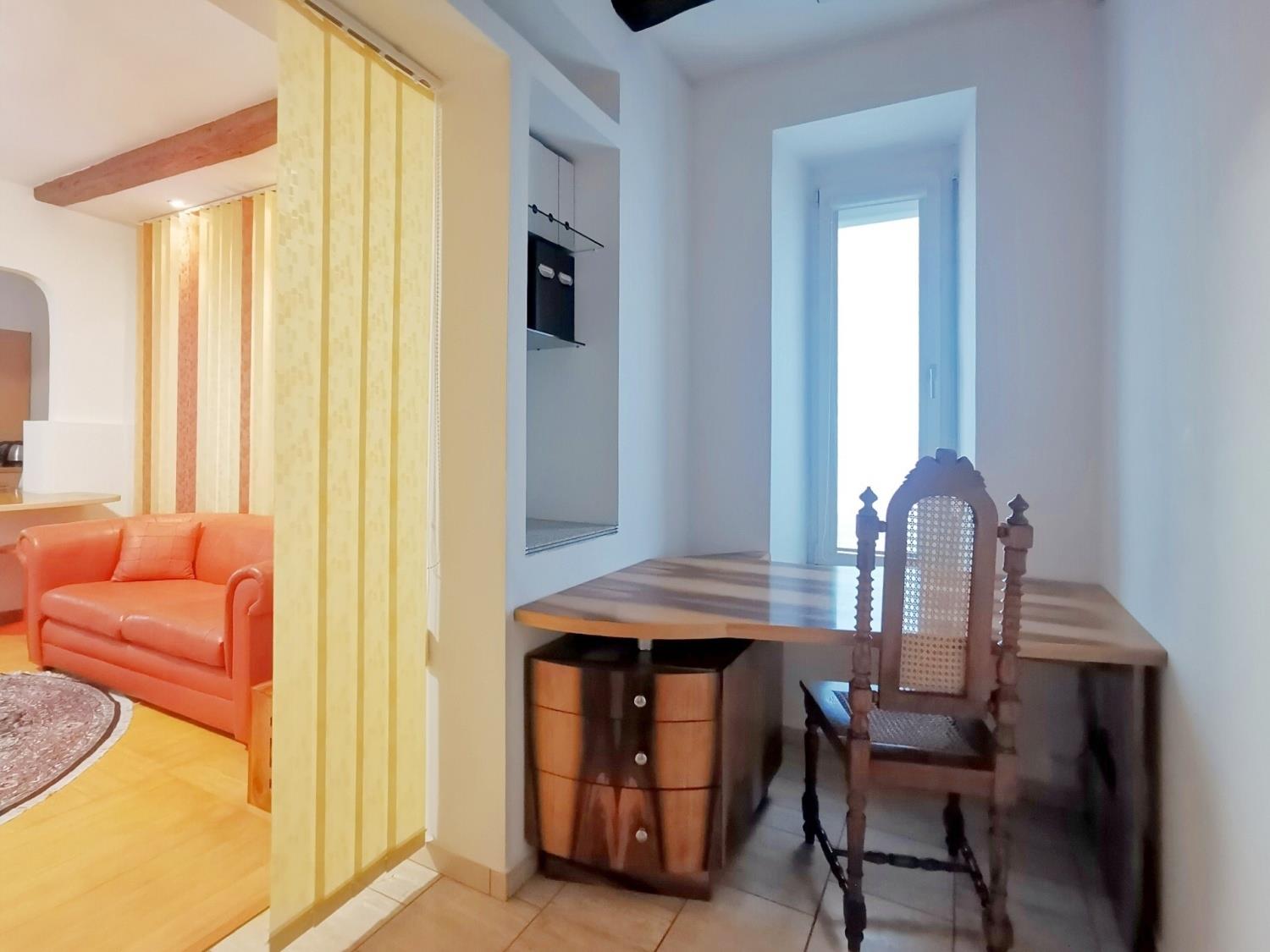 Byt má dvě ložnice, prostorný obývací pokoj propojený s kompletně zařízenou kuchyní, koupelnu a pracovní kout. Dispozice se samostatnými vstupy do všech místností poskytuje maximální komfort a soukromí.